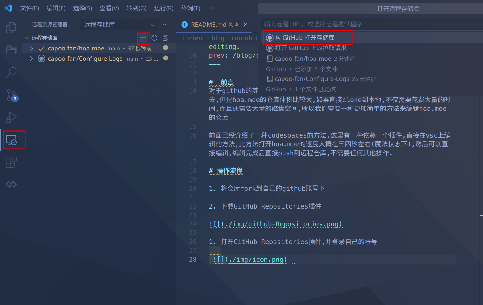 这里有一种依赖一个插件,直接在vsc上编辑的方法,此方法打开hoa.moe的速度大概在三四秒左右(魔法状态下),然后可以直接编辑,编辑完成后直接push到远程仓库,不需要任何其他操作.
